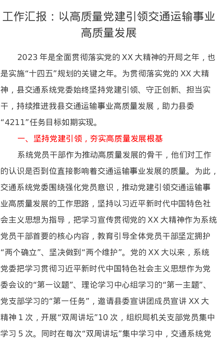 工作汇报:以高质量党建引领交通运输事业高质量发展
