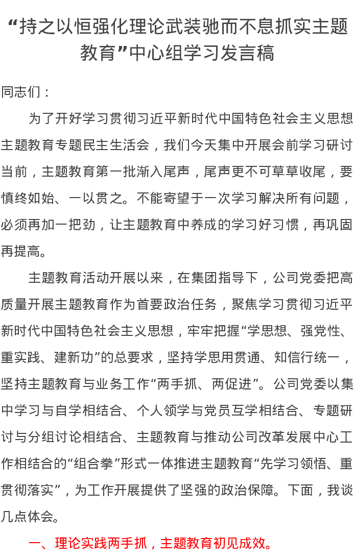 “持之以恒强化理论武装驰而不息抓实主题教育”中心组学习发言稿