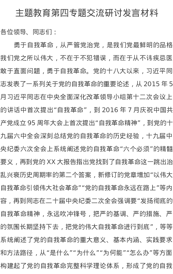 主题教育第四专题交流研讨发言材料(特色社会主义思想)从严治党