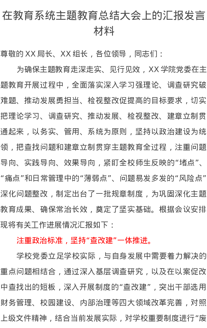 在教育系统主题教育总结大会上的汇报发言材料(特色社会主义思想)