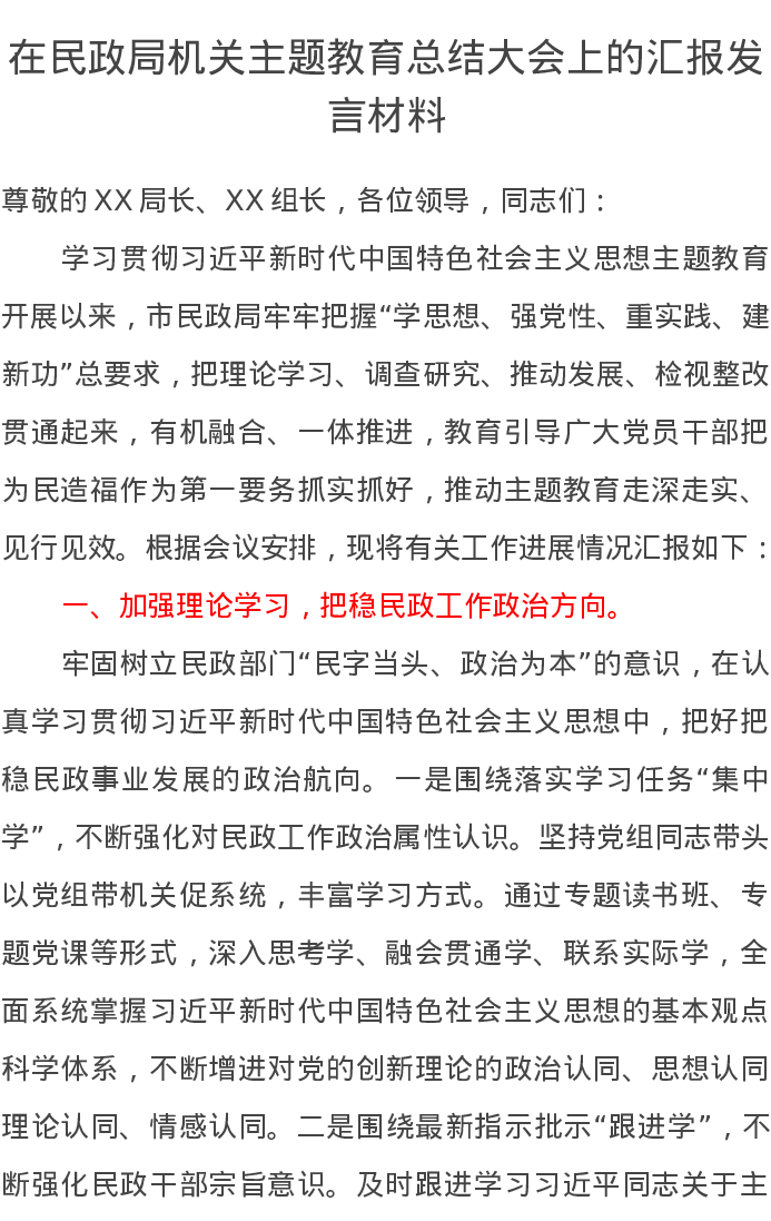 在民政局机关主题教育总结大会上的汇报发言材料(特色社会主义思想)