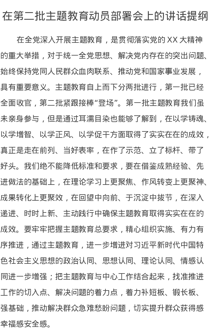 在第二批主题教育动员部署会上的讲话提纲(特色社会主义思想)