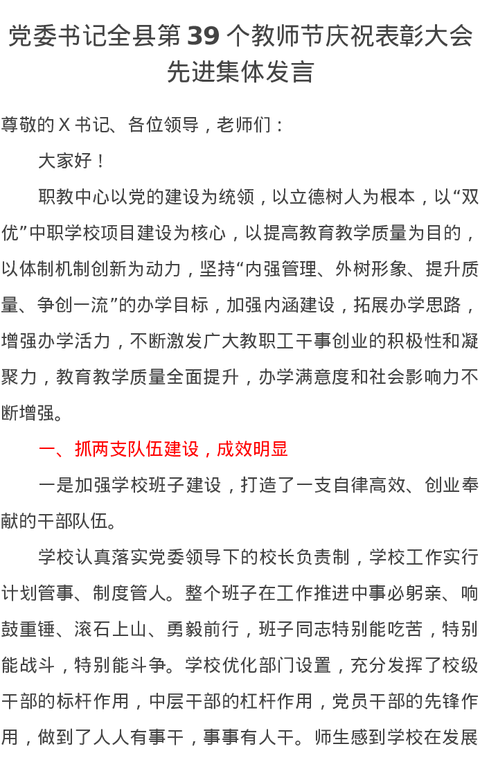 党委书记全县第39个教师节庆祝表彰大会先进集体发言
