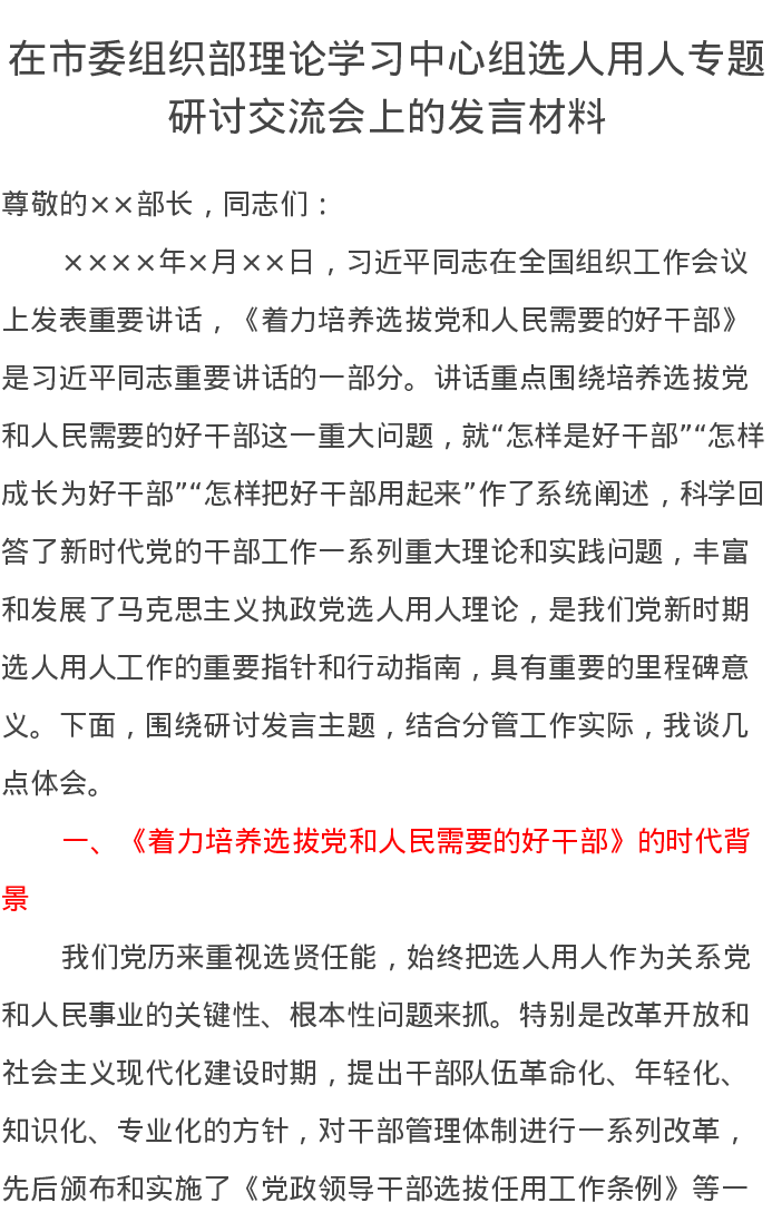 在市委组织部理论学习中心组选人用人专题研讨交流会上的发言材料