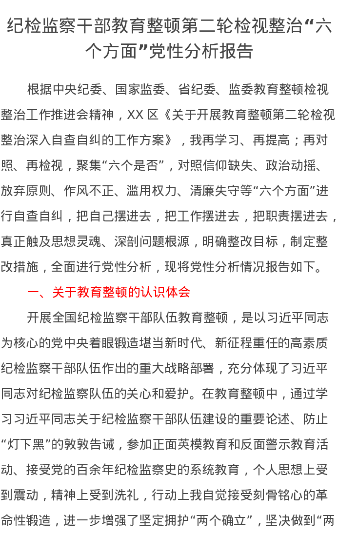 纪检监察干部教育整顿第二轮检视整治“六个方面”党性分析报告