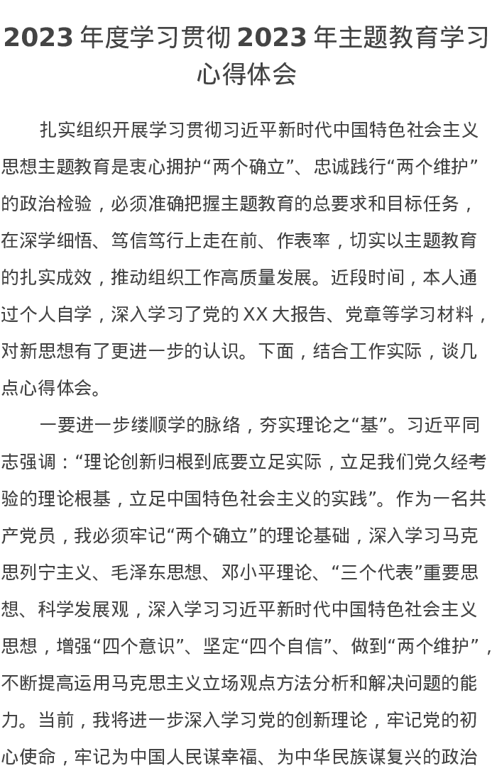 2023年度学习贯彻2023年主题教育学习心得体会(特色社会主义思想)
