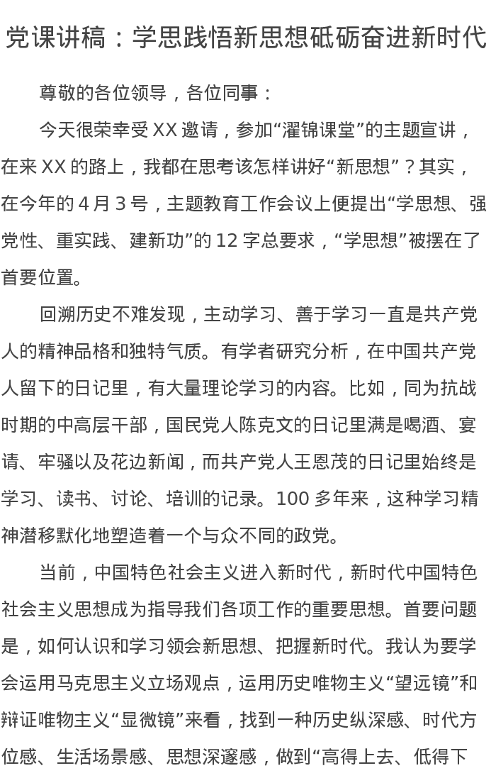 党课讲稿:学思践悟新思想砥砺奋进新时代