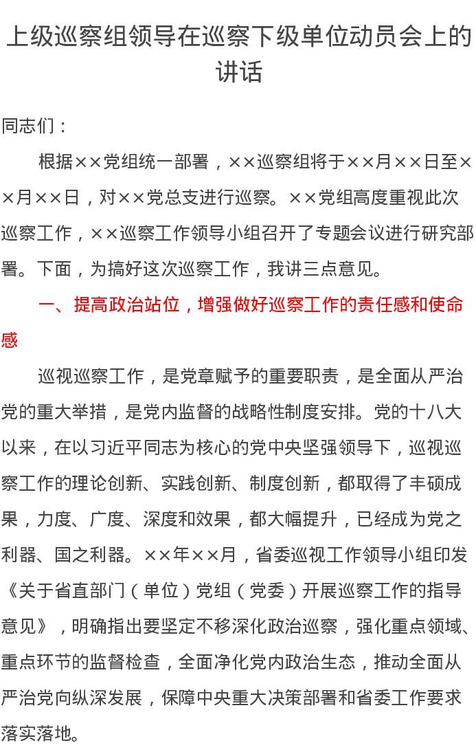 上级巡察组领导在巡察下级单位动员会上的讲话
