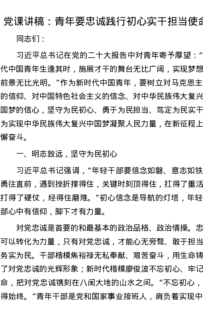 党课讲稿:青年要忠诚践行初心 实干担当使命
