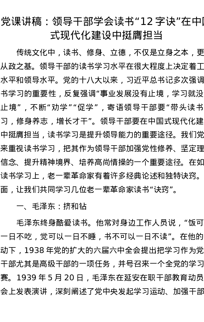 党课讲稿:领导干部学会读书“12字诀” 在中国式现代化建设中挺膺担当