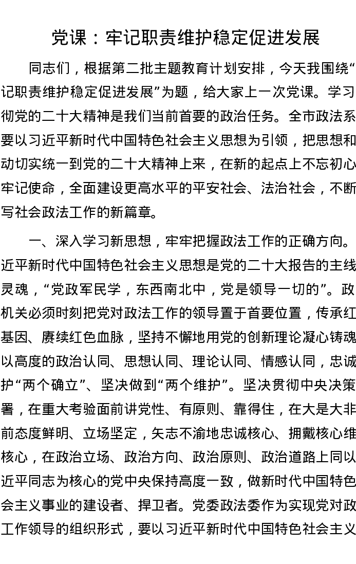 党课:牢记职责 维护稳定 促进发展