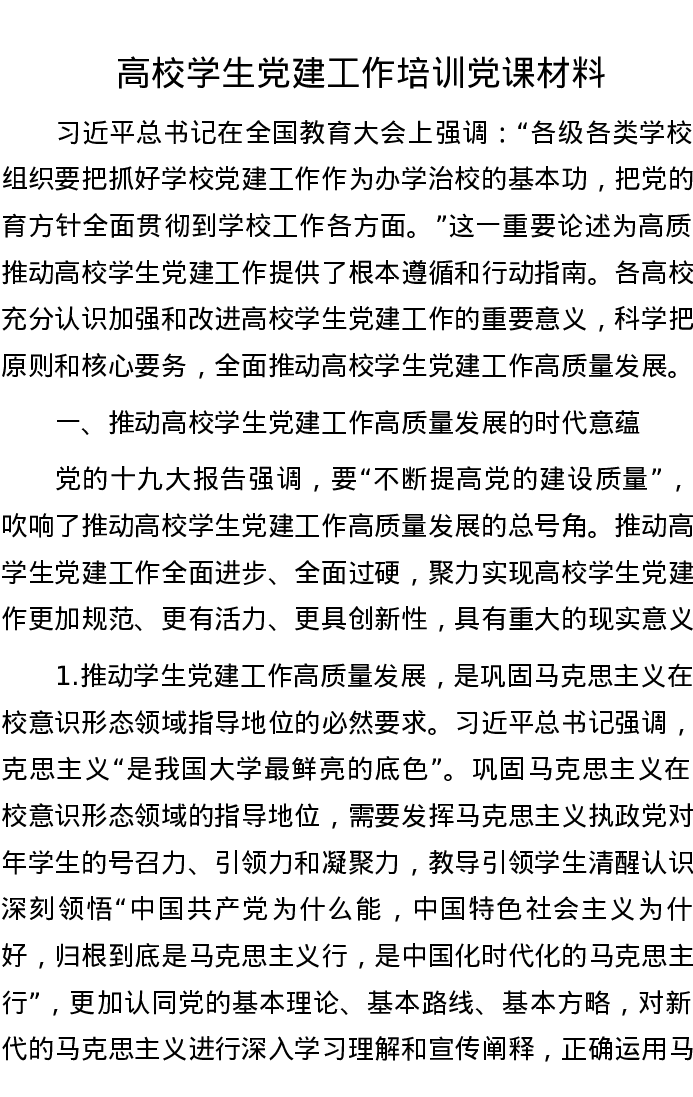 高校学生党建工作培训党课材料