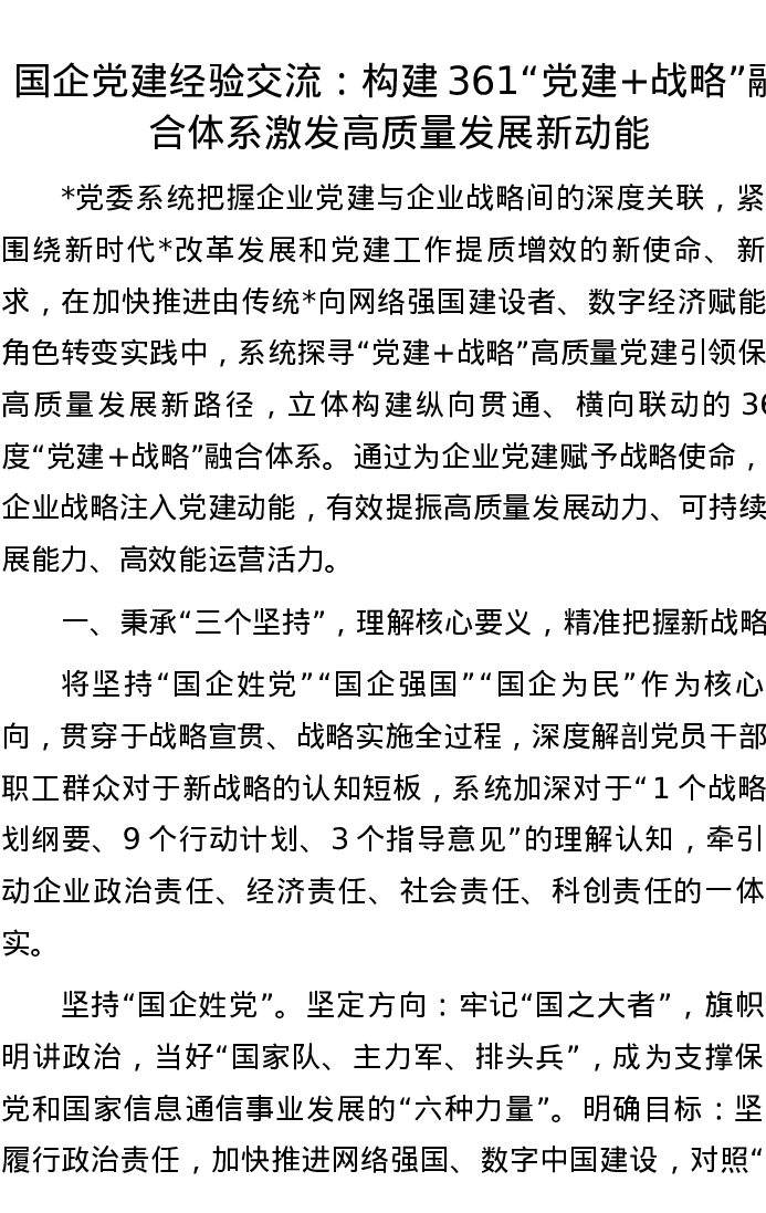 国企党建经验交流 :构建361“党建+战略”融合体系 激发高质量发展新动能