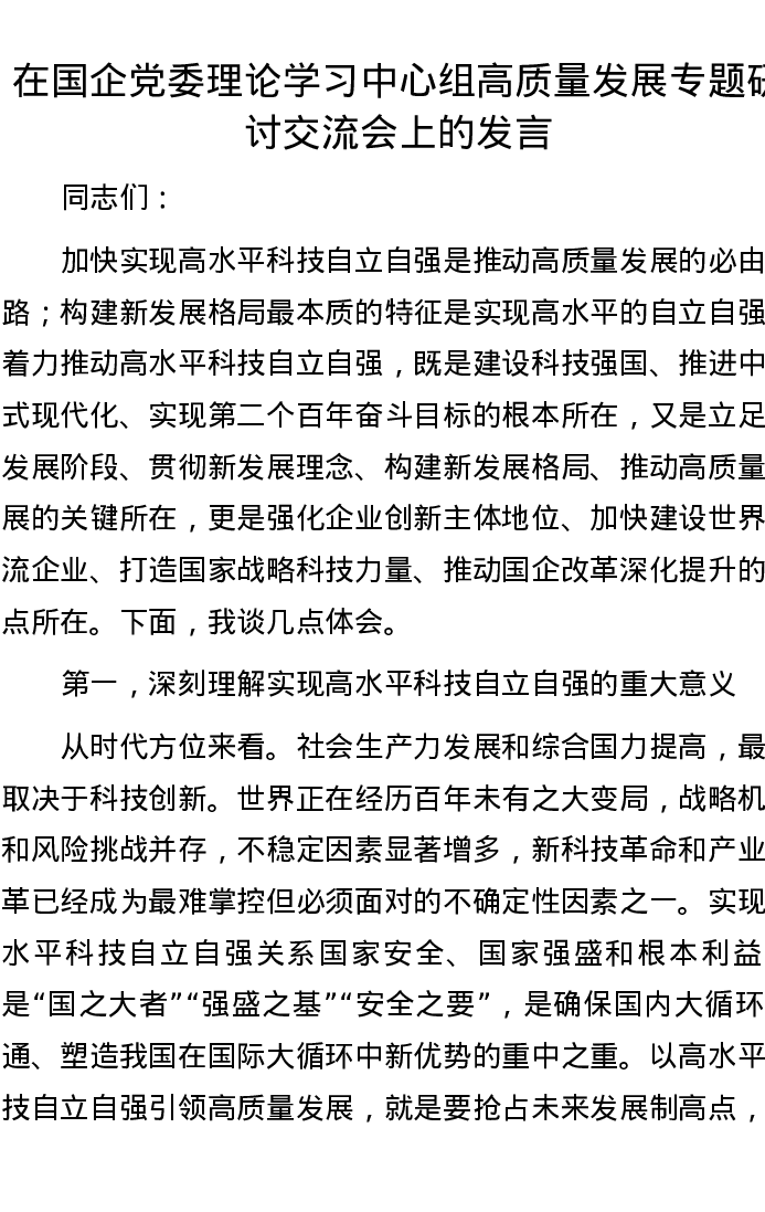 在国企党委理论学习中心组高质量发展专题研讨交流会上的发言