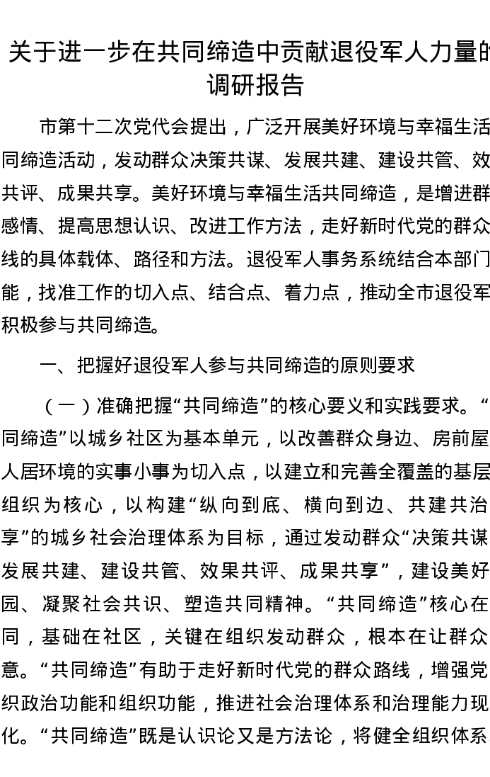 关于进一步在共同缔造中贡献退役军人力量的调研报告