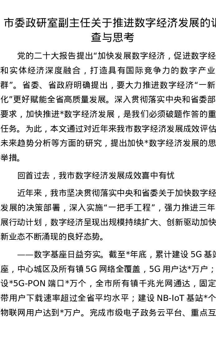 市委政研室副主任关于推进数字经济发展的调查与思考