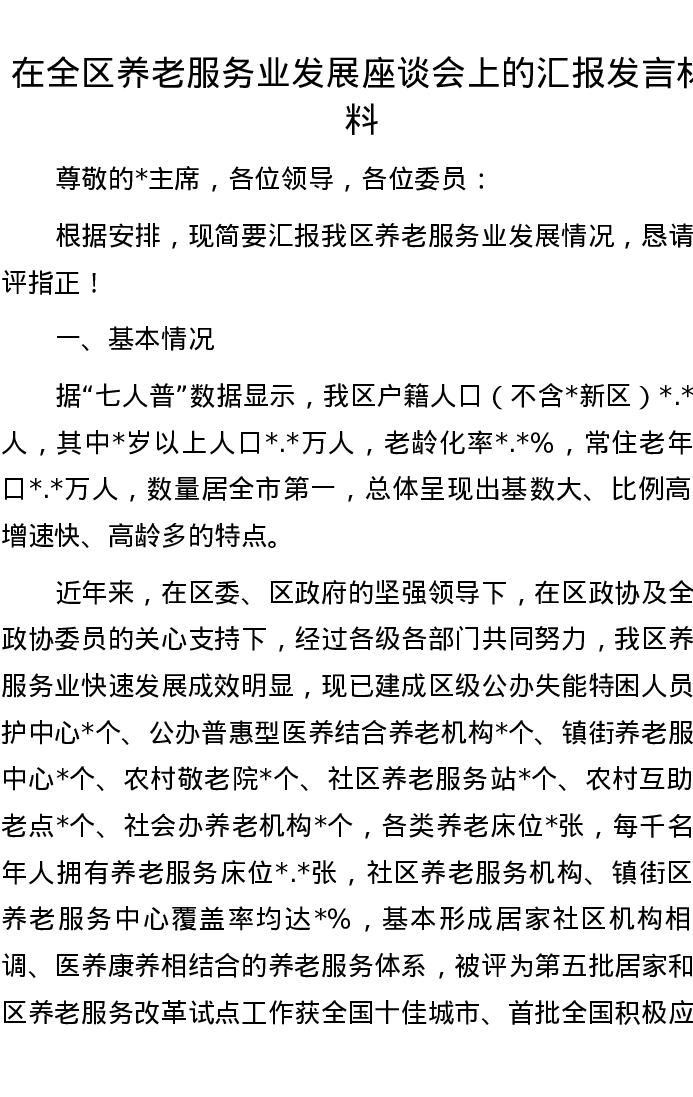 在全区养老服务业发展座谈会上的汇报发言材料