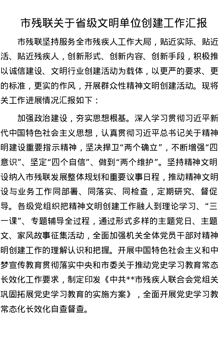 市残联关于省级文明单位创建工作汇报