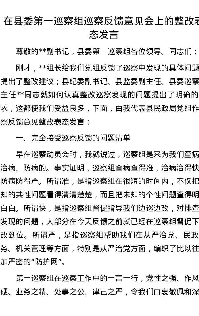 在县委第一巡察组巡察反馈意见会上的整改表态发言