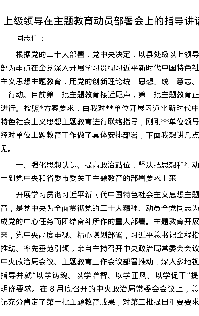 上级领导在主题教育动员部署会上的指导讲话