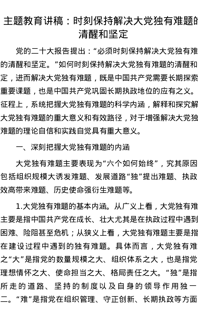 主题教育讲稿:时刻保持解决大党独有难题的清醒和坚定