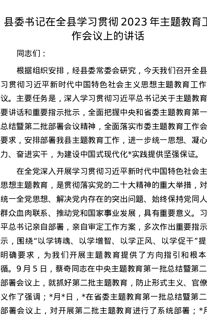 县委书记在全县学习贯彻2023年主题教育工作会议上的讲话