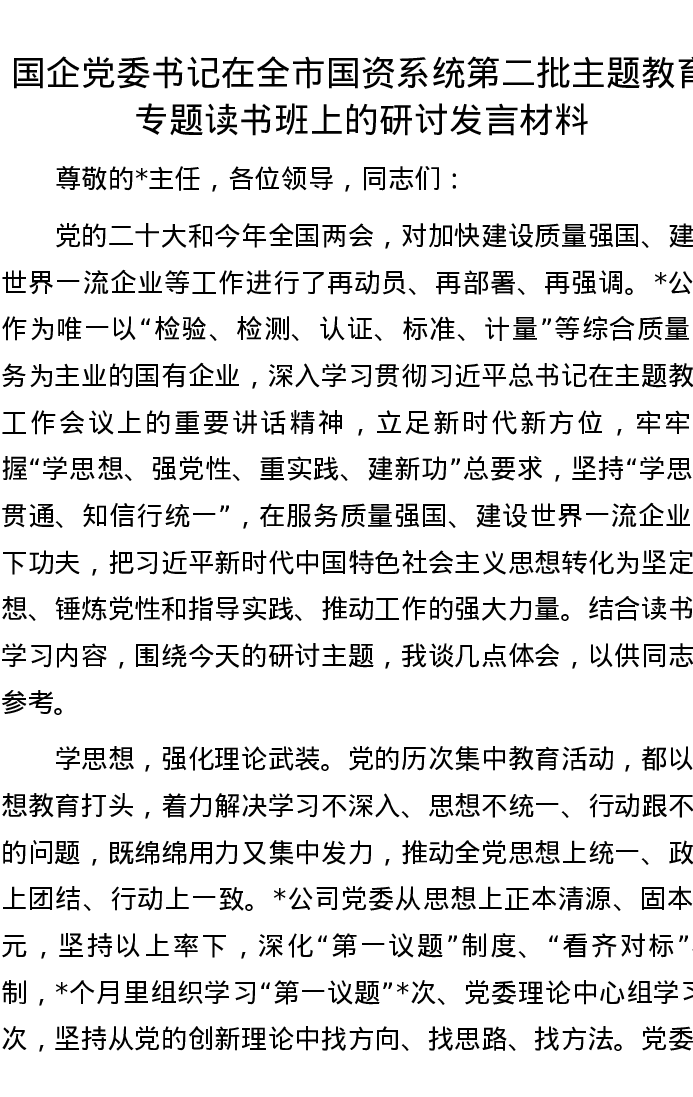 国企党委书记在全市国资系统第二批主题教育专题读书班上的研讨发言材料