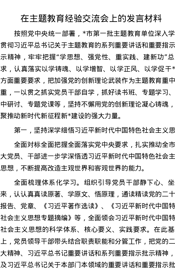 在主题教育经验交流会上的发言材料