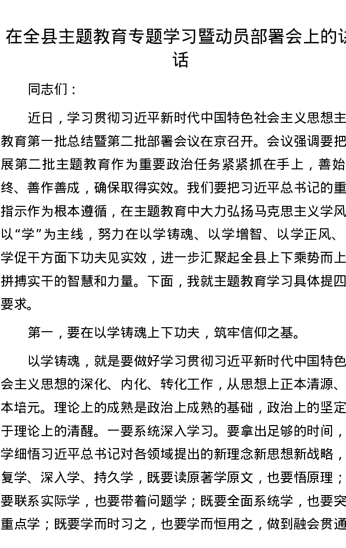 在全县主题教育专题学习暨动员部署会上的讲话