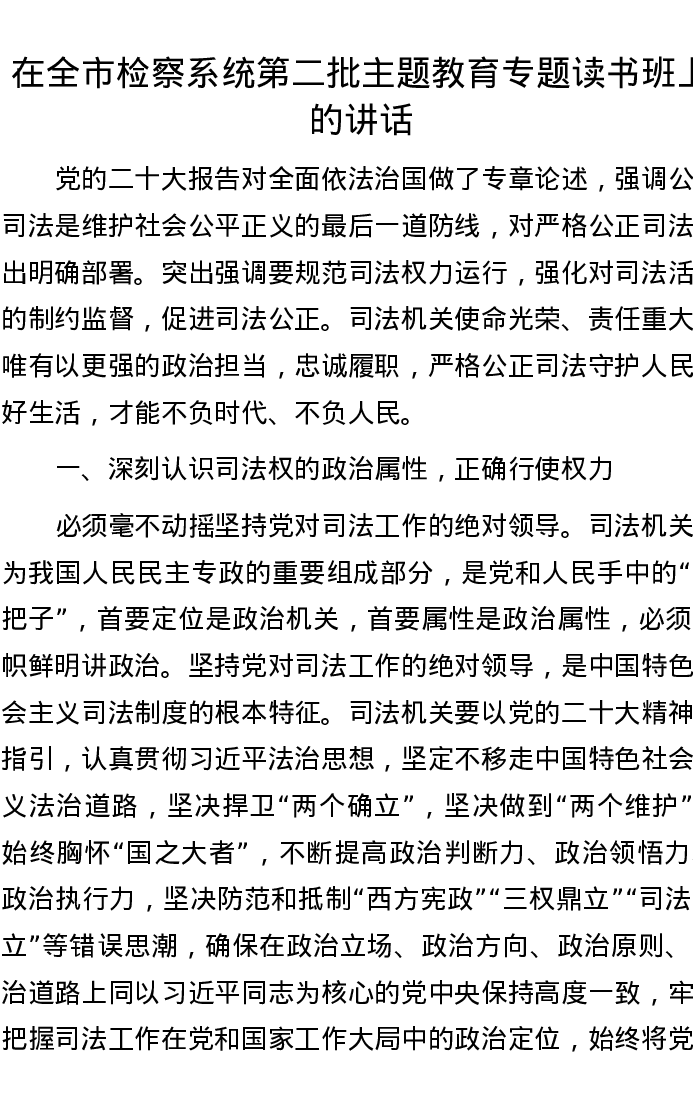 在全市检察系统第二批主题教育专题读书班上的讲话
