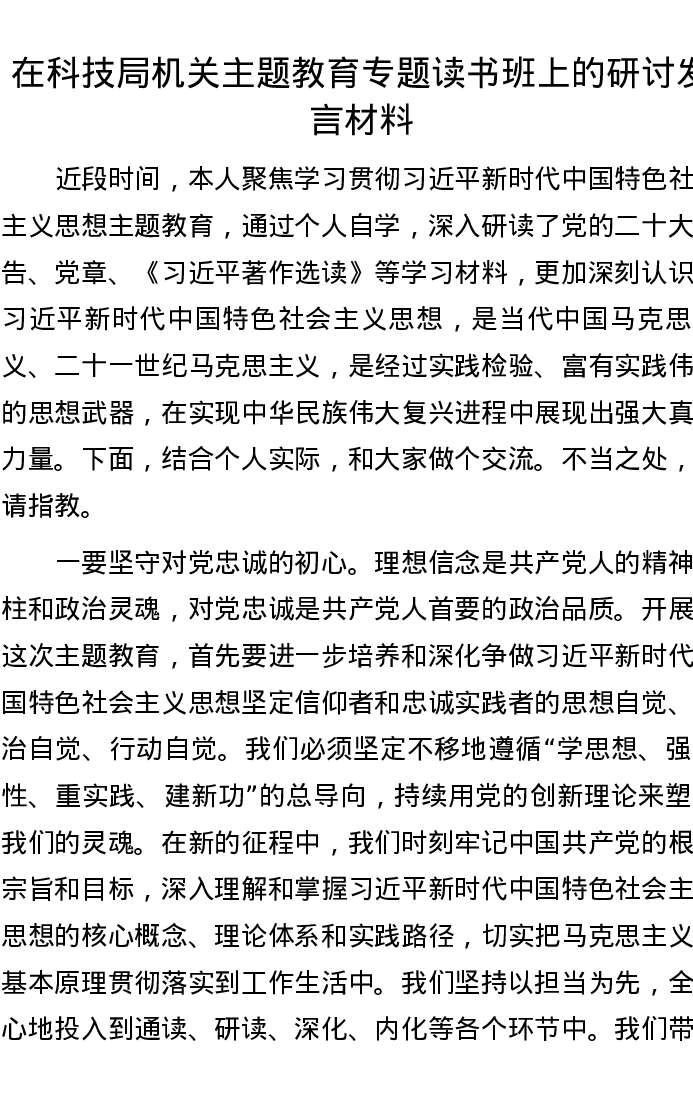 在科技局机关主题教育专题读书班上的研讨发言材料