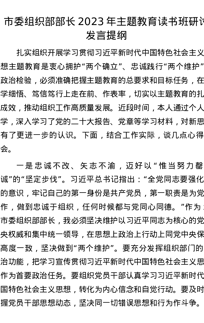 市委组织部部长2023年主题教育读书班研讨发言提纲