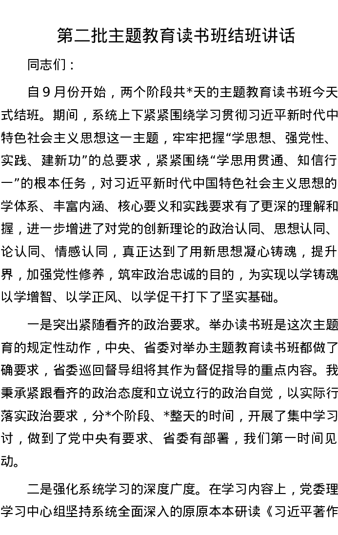 第二批主题教育读书班结班讲话