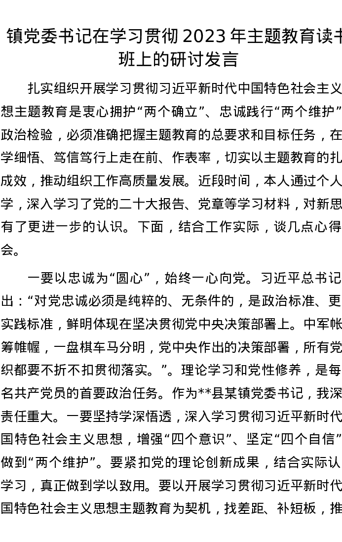 镇党委书记在学习贯彻2023年主题教育读书班上的研讨发言