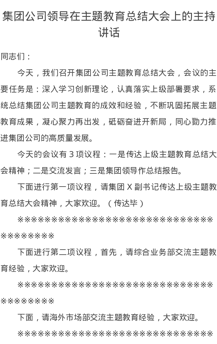 集团公司领导在主题教育总结大会上的主持讲话(特色社会主义思想)