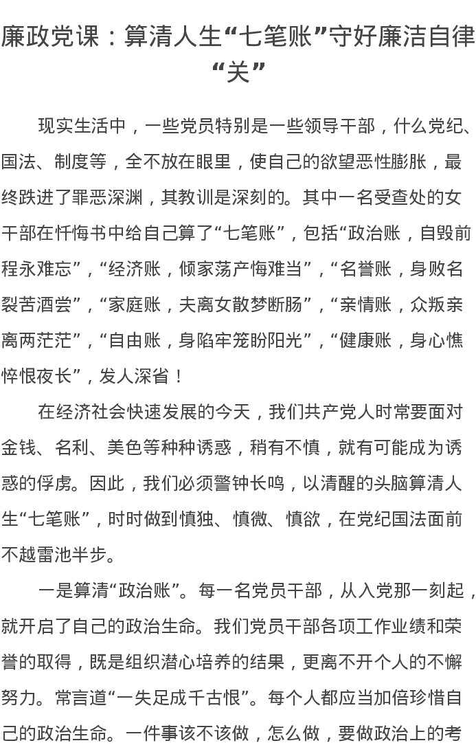 廉政党课讲稿:算清人生“七笔账”守好廉洁自律“关”