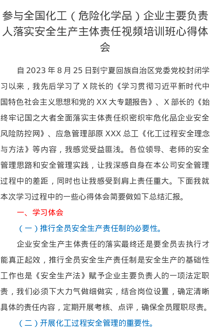 参与全国化工(危险化学品)企业主要负责人落实安全生产主体责任视频培训班心得体会