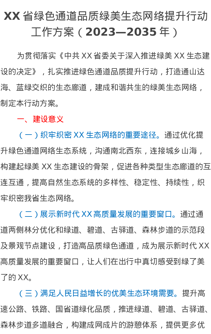 XX省绿色通道品质绿美生态网络提升行动工作方案(2023—2035年)