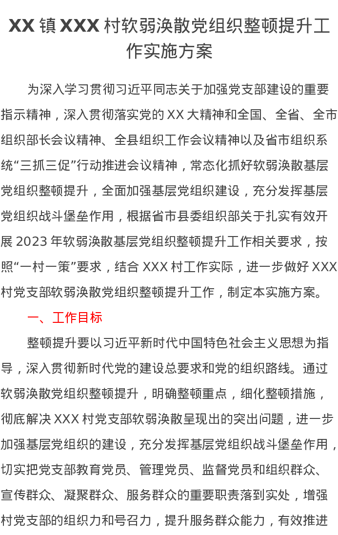 XX镇XXX村软弱涣散党组织整顿提升工作实施方案