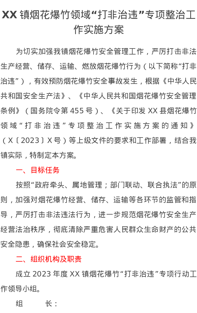 XX镇烟花爆竹领域“打非治违”专项整治工作实施方案