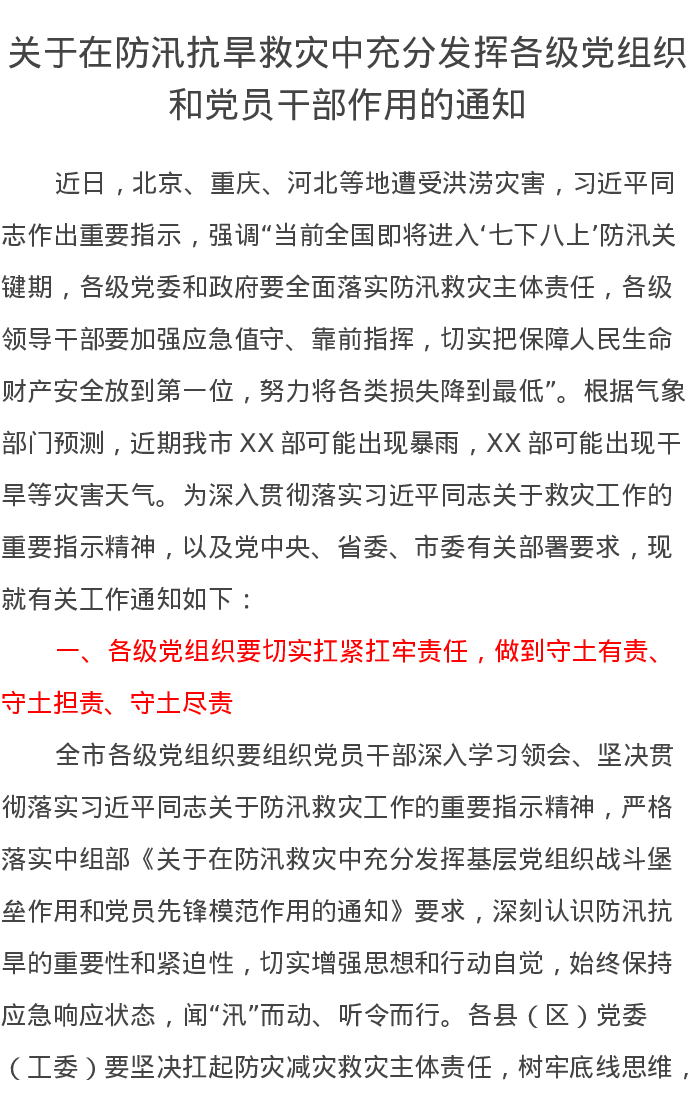 关于在防汛抗旱救灾中充分发挥各级党组织和党员干部作用的通知