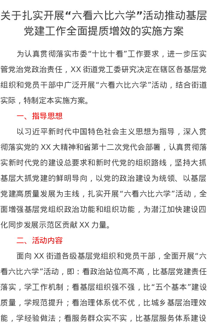 关于扎实开展“六看六比六学”活动推动基层党建工作全面提质增效的实施方案