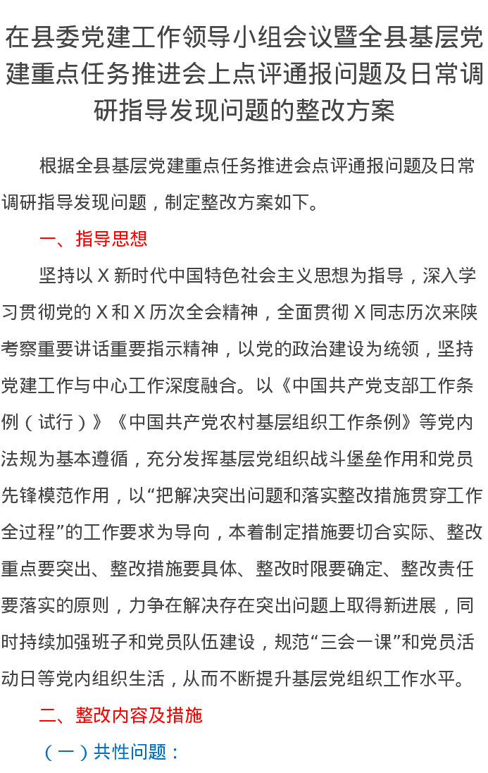 在县委党建工作领导小组会议暨全县基层党建重点任务推进会上点评通报问题及日常调研指导发现问题的整改方案