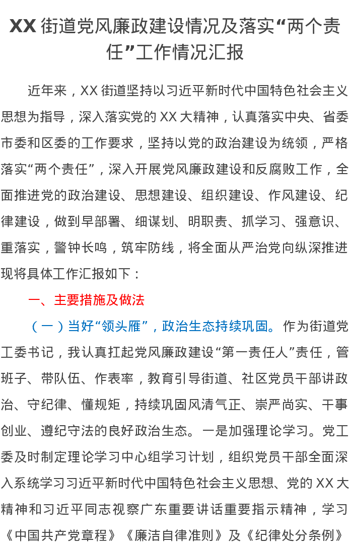 XX街道党风廉政建设情况及落实“两个责任”工作情况汇报
