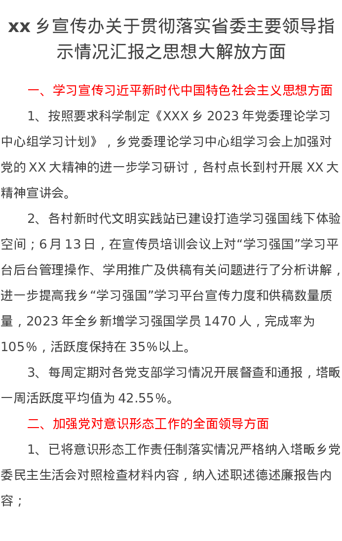 xx乡宣传办关于贯彻落实省委主要领导指示情况汇报之思想大解放方面