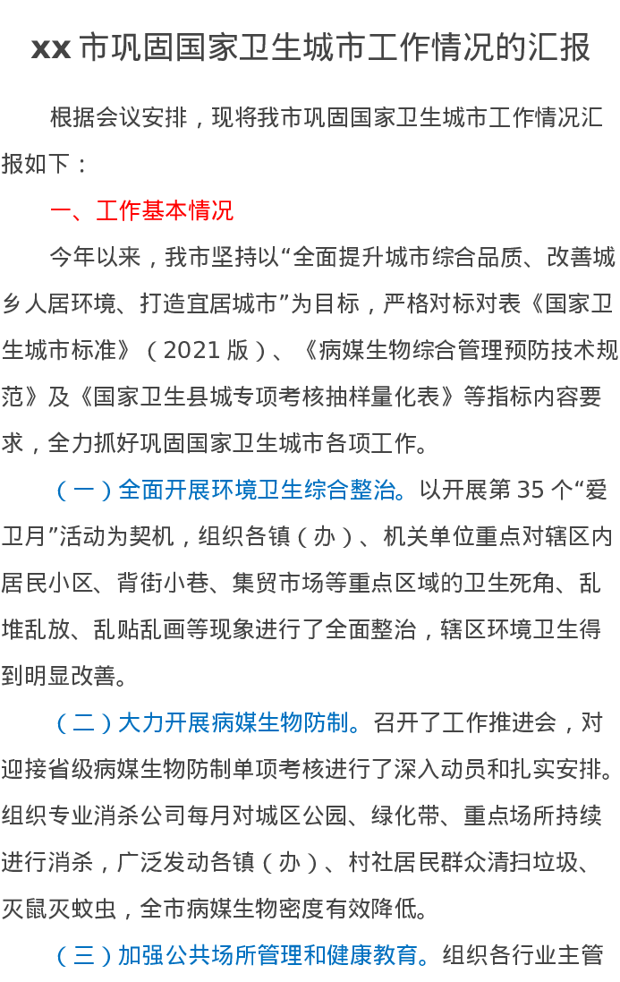 xx市巩固国家卫生城市工作情况的汇报