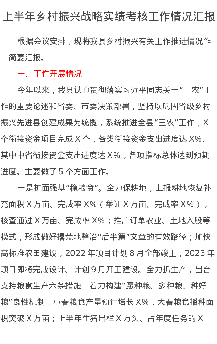 上半年乡村振兴战略实绩考核工作情况汇报