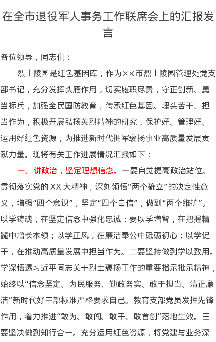 在全市退役军人事务工作联席会上的汇报发言