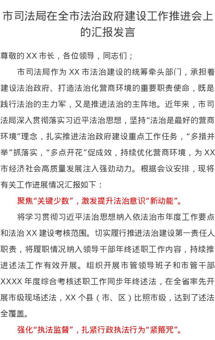 市司法局在全市法治政府建设工作推进会上的汇报发言