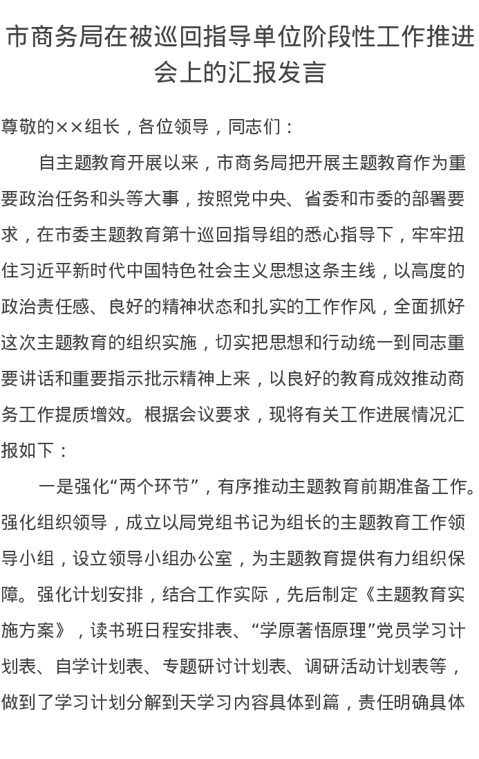市商务局在被巡回指导单位阶段性工作推进会上的汇报发言